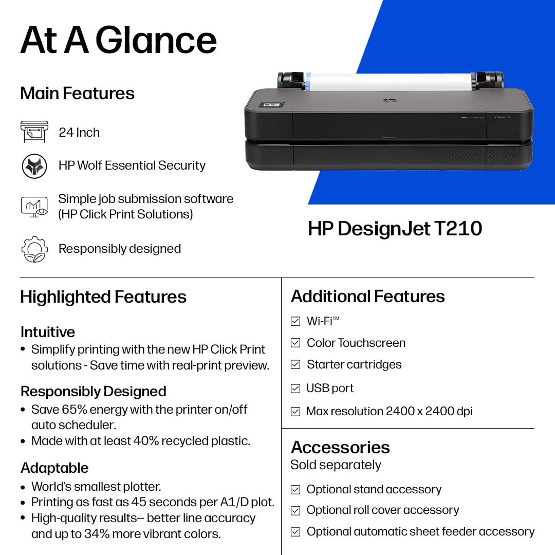 HP DesignJet T210 Large Format 24-inch Color Plotter Printer for Easy Wide CAD & Poster Prints (8AG32D)—